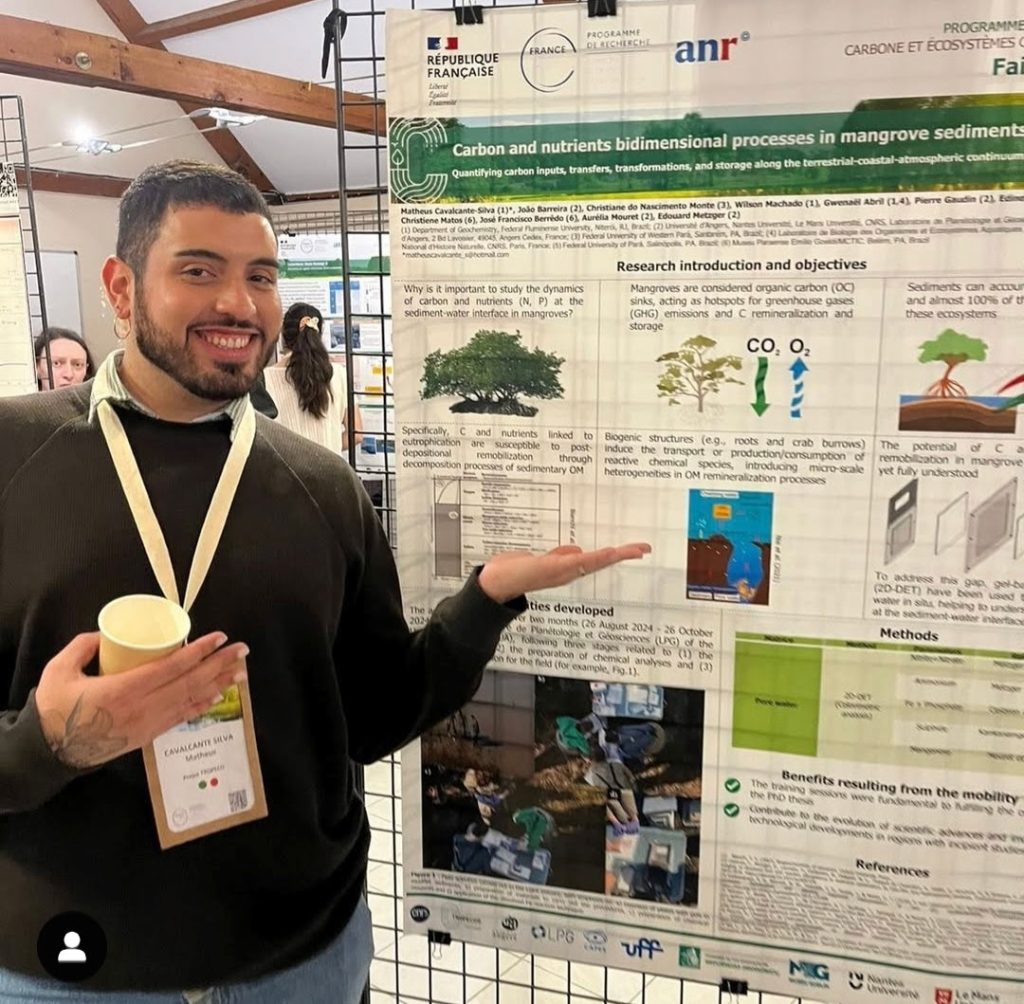 O discente Matheus Cavalcante Silva apresentou o pôster “Carbon and nutrient bidimensional processes in mangrove sediments”, compartilhando resultados de sua tese, que explora o ciclo do carbono em manguezais brasileiros por meio da tecnologia 2D-DET.