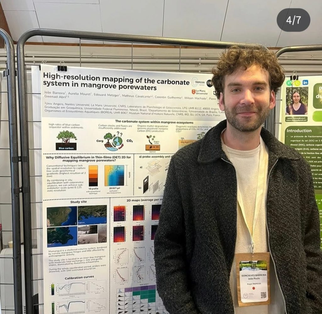 O egresso João Paulo Barreira, atualmente pós-doutorando na Universidade de Angers (França), apresentou o pôster “High-resolution mapping of the carbonate system in mangrove porewaters”, demonstrando como as técnicas 2D-DET permitem visualizar a dinâmica do carbono em sedimentos com alta resolução.