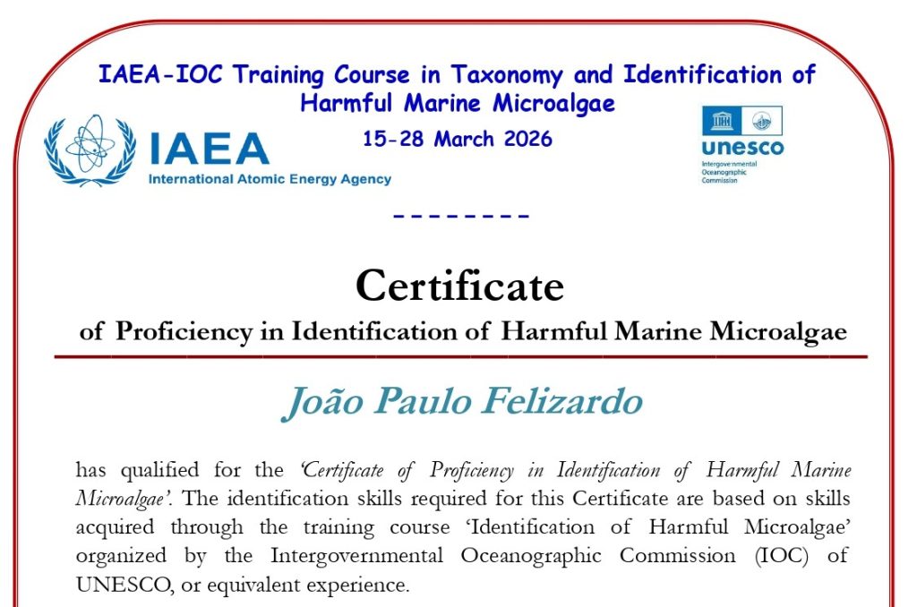 O Certificate of Proficiency in Identification of Harmful Marine Microalgae foi concedido no âmbito do curso internacional “IAEA-IOC Training Course in Taxonomy and Identification of Harmful Marine Microalgae”, realizado entre 15 e 28 de março de 2026, em parceria entre a International Atomic Energy Agency (IAEA) e a Intergovernmental Oceanographic Commission da UNESCO.